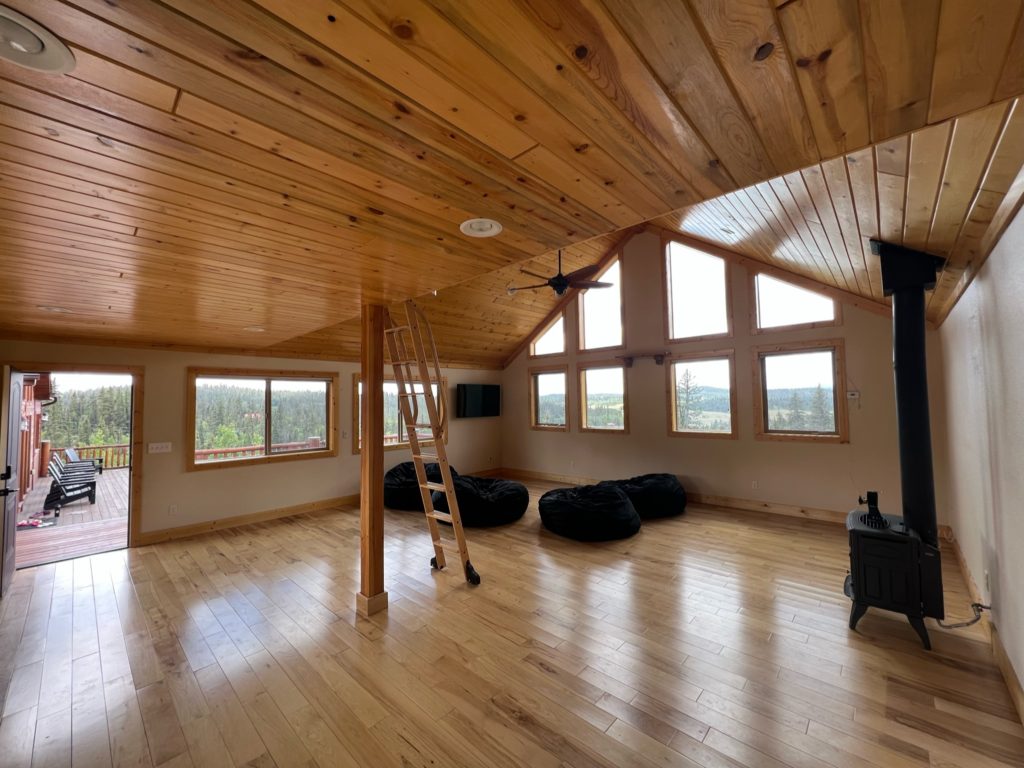 Roughly 600 square feet of space gives you plenty of room to gather and move how you need. Move the bean bag chairs out of the way, or use them. Spread out the mats, or leave them folded away. The loft ladder folds up flat against the pole for extra room.